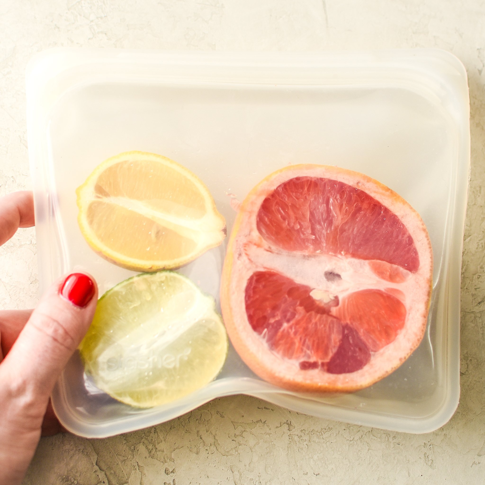 - Silicone Storage Bags: I use multiple sizes of these Stasher Silicone Food Storage Bags (affiliate link!). I use them *mostly* for storing leftover produce or cut citrus. They do not hold liquids well, but anything else works just fine. They are freezer, sous vide, microwave and dishwasher safe.