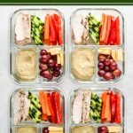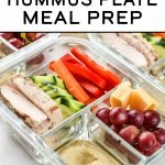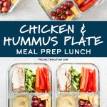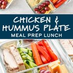 This Chicken & Hummus Plate Lunch Meal Prep is so simple yet incredibly filling and delicious! Get back to basics with fresh cut bell pepper, carrot, cucumbers, paired with chicken breast, cheese slices, and grapes for a touch of sweetness. Simple portioning instructions included!