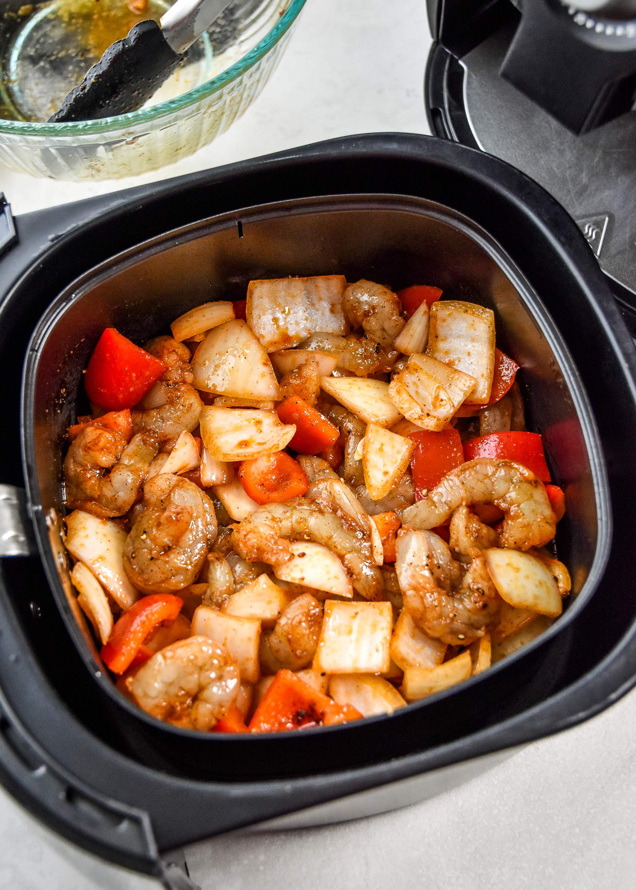Bell peppers and onions are a favorite combo of mine and I really enjoy how they cook without getting soggy in the air fryer. But if you have more veggies hanging out in the fridge, try tossing them in too. Make sure to cut them to about the same size as the shrimps!