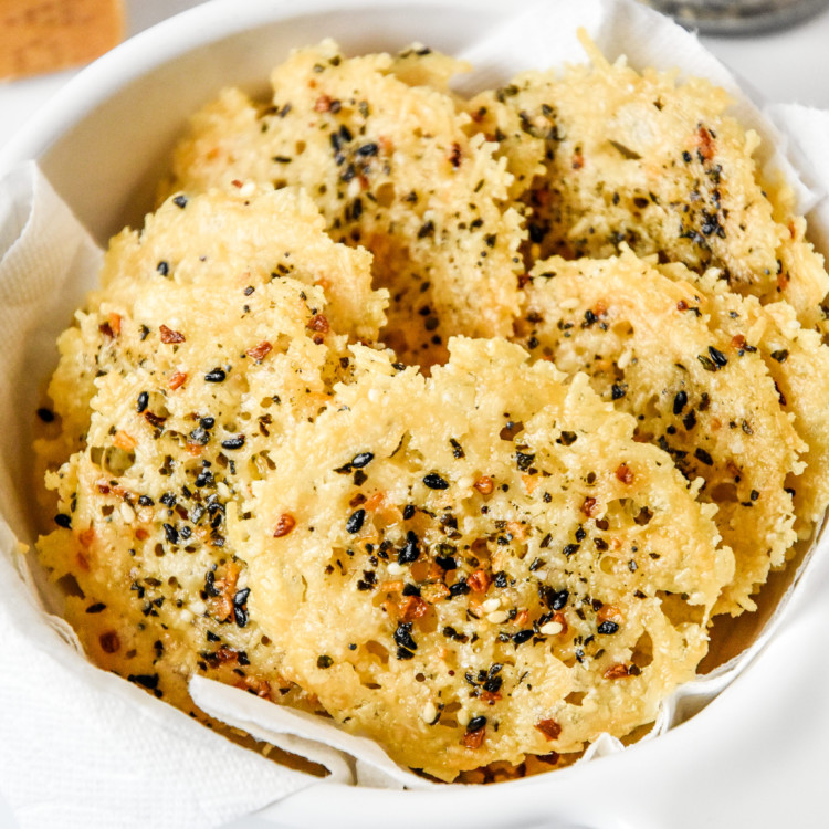 Add a little everything to your homemade parmesan crisps! This 2-ingredient oven baked snack is easy, delicious, low-carb, and perfectly crunchy! You’ll love these Everything Bagel Baked Parmesan Crisps!