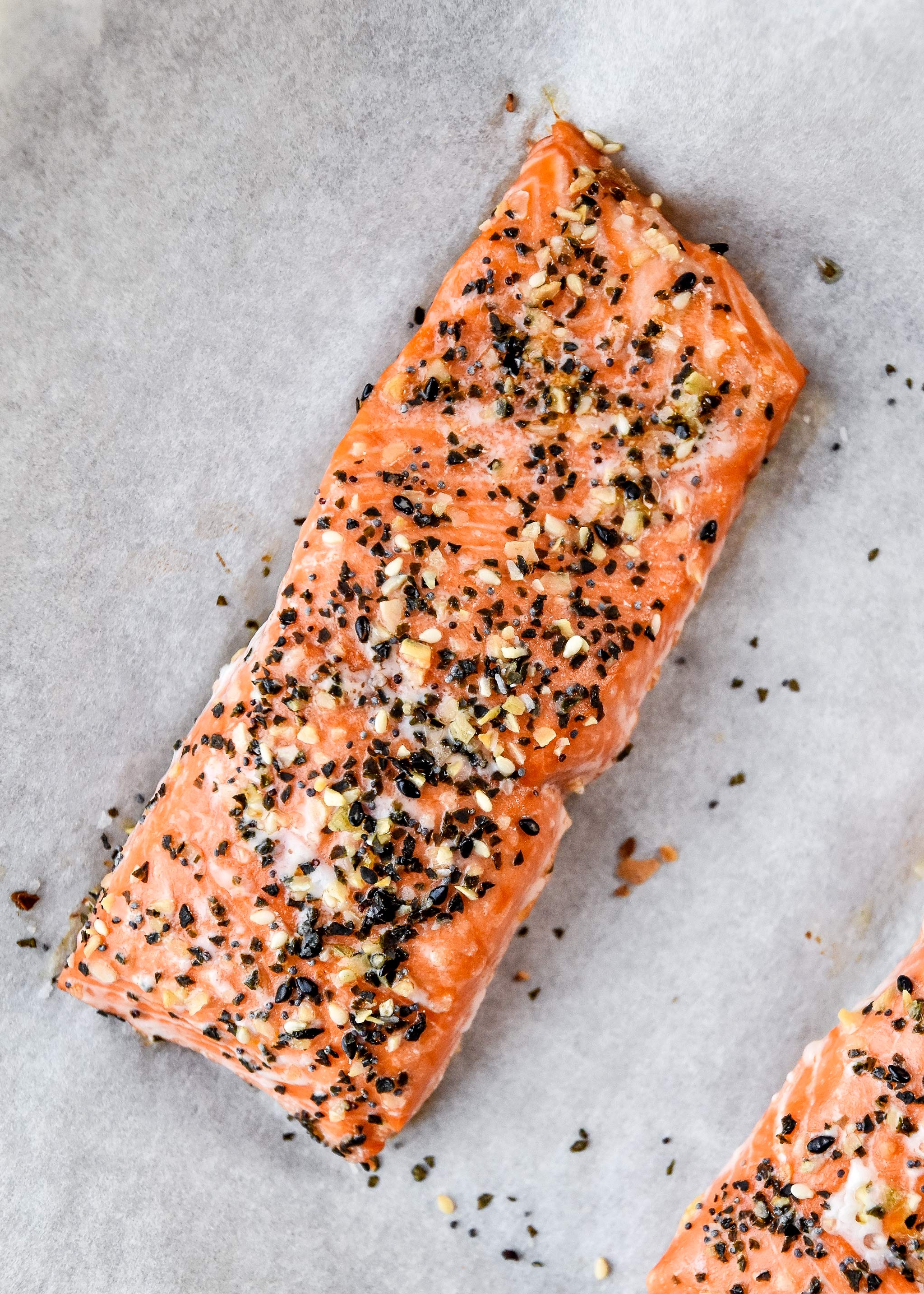 Preheat the oven to 425F. Line your baking sheet with parchment paper and the salmon won’t stick at all! Place the fillets skin side down on the parchment and then brush the top with olive oil. Generously sprinkle each fillet with everything but the bagel seasoning.
