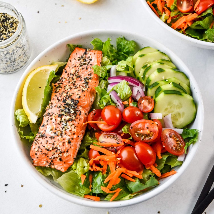 These delicious Everything Bagel Baked Salmon Salad Bowls are a quick and easy to make weeknight dinner option! They take just 20 minutes start to finish and they’re simple to customize with your favorite dressing and veggies.