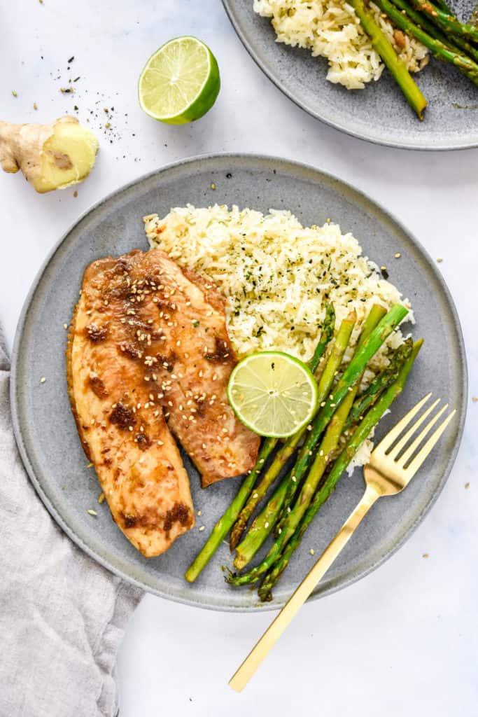 This Ginger Soy Tilapia and Broiled Asparagus is a flavor-packed, budget-friendly dinner served with rice and made in 30 minutes. Loaded with ginger and lime, it’s a delicious weeknight meal for two with no leftovers to deal with!