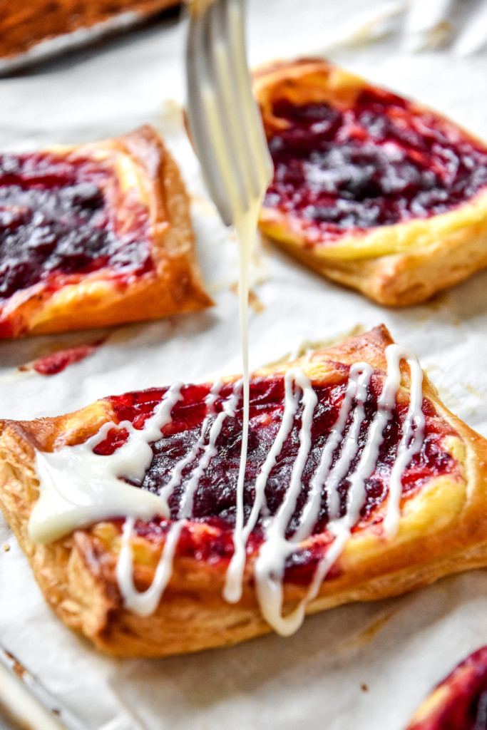 Once the danish have cooled for at least 15 minutes, drizzle the icing on top of each one. Serve the danish while still they’re still slightly warm with any of the leftover frosting. Be prepared to impress everyone!