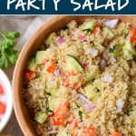 This Make-Ahead Quinoa Party Salad is my bring-everywhere, better-as-leftovers, easy-to-make potluck salad. It’s packed with cucumbers, bell pepper, red onion, all in a simple lemony dressing. Meal prep for lunch or dinner!