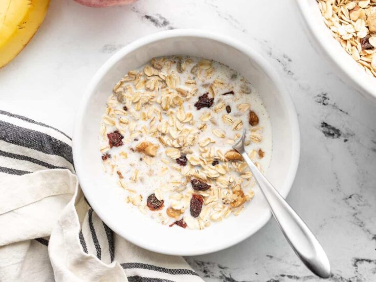 If overnight oats are not so much your thing, have you thought about trying muesli? It's usually a dry mixture of rolled oats, dried fruit and nuts. Pour on some milk, and breakfast is served! This works best (in my opinion) with quick cooking rolled oats. They are the thinnest and easiest to chew!