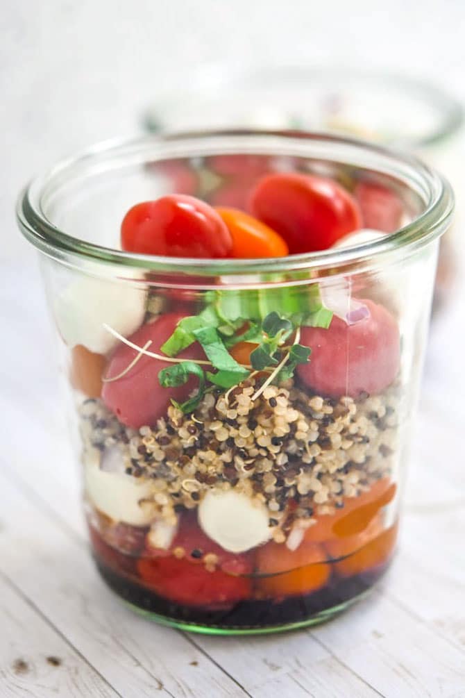 Mason jar salads are always a good meal prep option, but this one especially. Two reasons this recipe is gold: it's a great way to use up summer tomatoes, and it's perfection if you love cheese for lunch. I bet some fresh basil would be a nice touch!