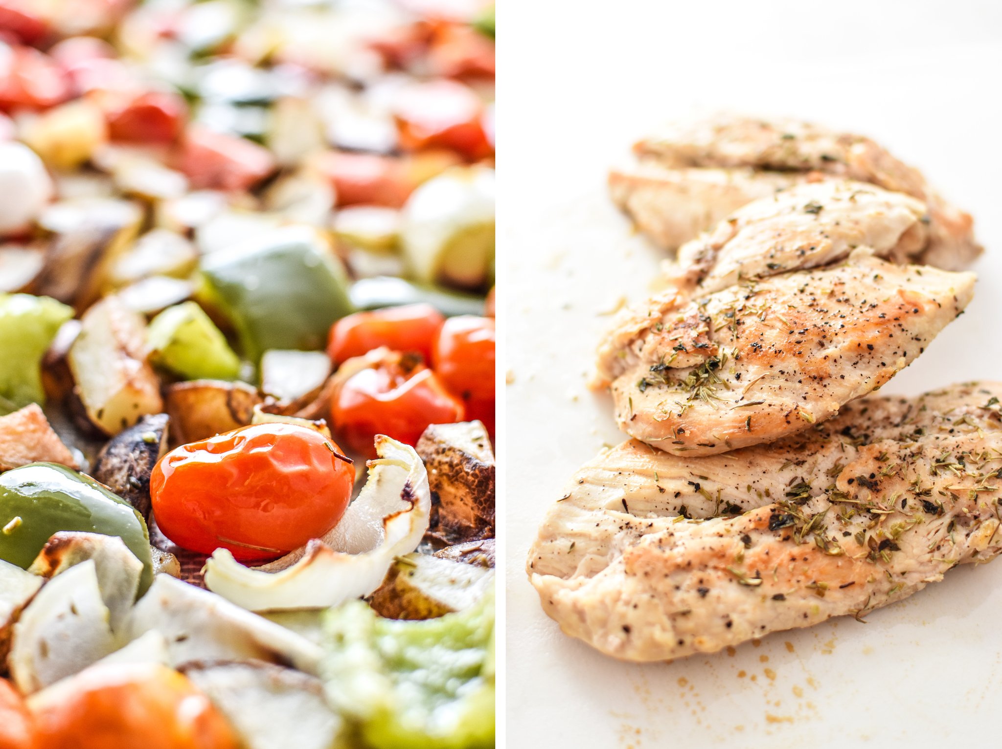Meal Prep Italian Seasoned Chicken with Roasted Imperfect Vegetables including potatoes, cherry tomatoes, onions, and bell peppers!