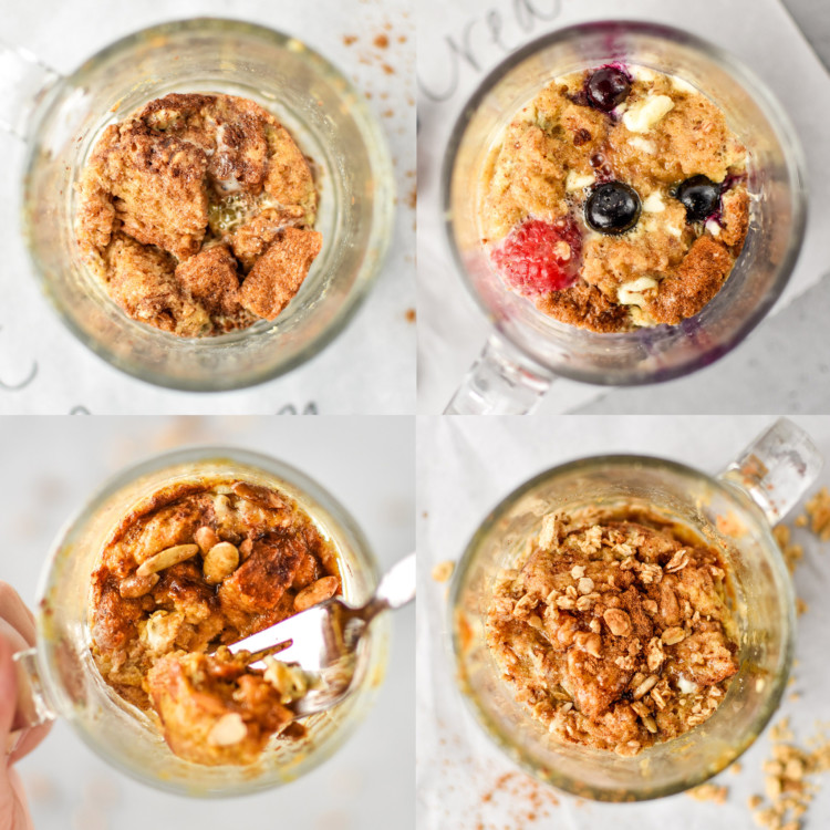 Use coconut oil (or butter) to grease the inside of a microwave safe mug. Crack the egg into the mug and whisk briefly. Add all remaining ingredients to the mug except the bread cubes (for PB crunch, do not add granola until after cooking). Stir until the egg/milk mixture is completely mixed. If adding peanut butter or cream cheese, use your fork to break it up so no large clumps remain.
