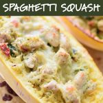 Pesto Chicken Stuffed Spaghetti Squash is a creamy & delicious squash based dinner for two, packed with protein from chicken breast, Greek yogurt and baby spinach! Make-ahead friendly – it makes wonderful leftovers!