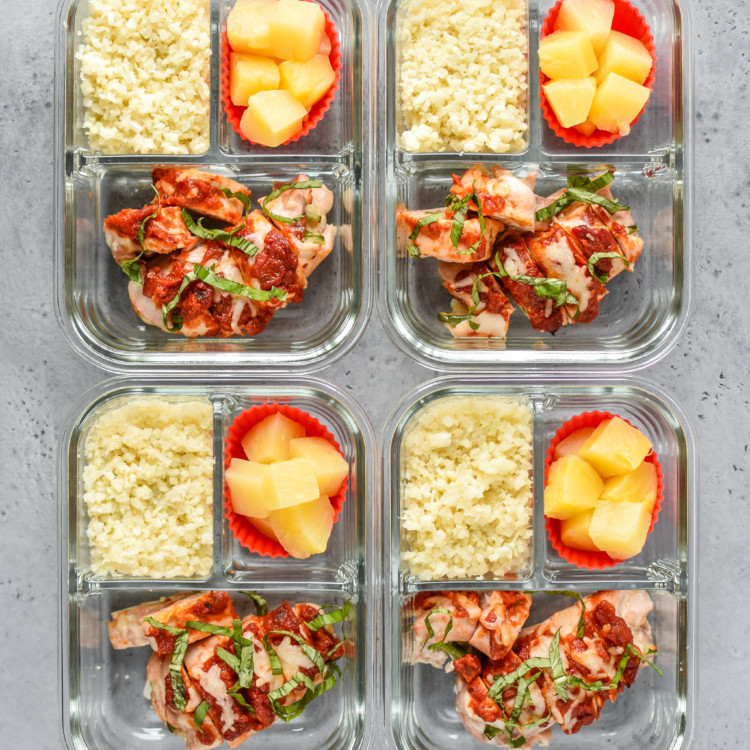 Pizza Chicken Roll Ups Meal Prep is a creative and lightened-up meal prep option complete with cheese and pepperoni stuffed chicken thighs, Parmesan cauliflower rice, and a side of pineapple (for the pizza of course!).