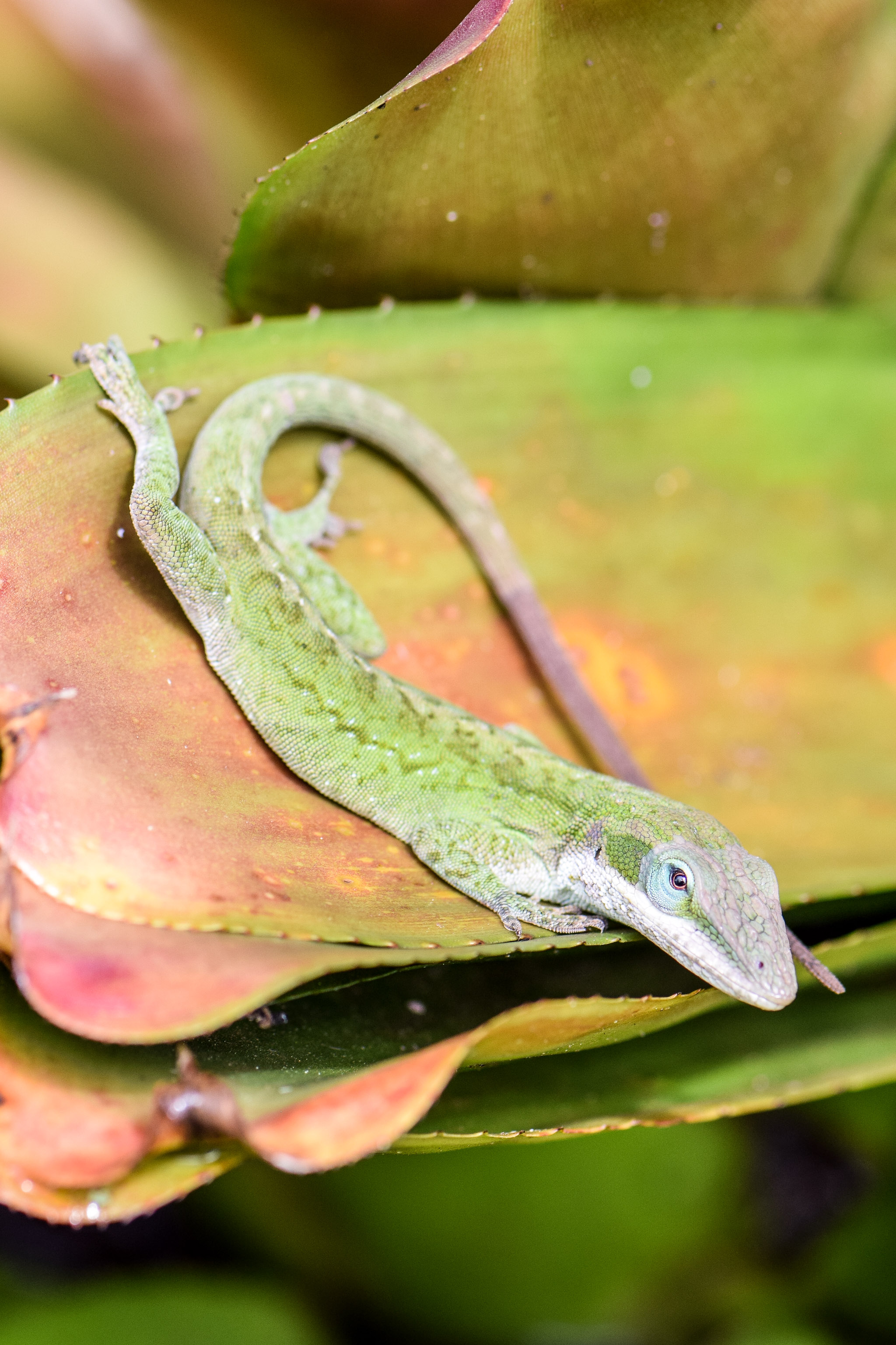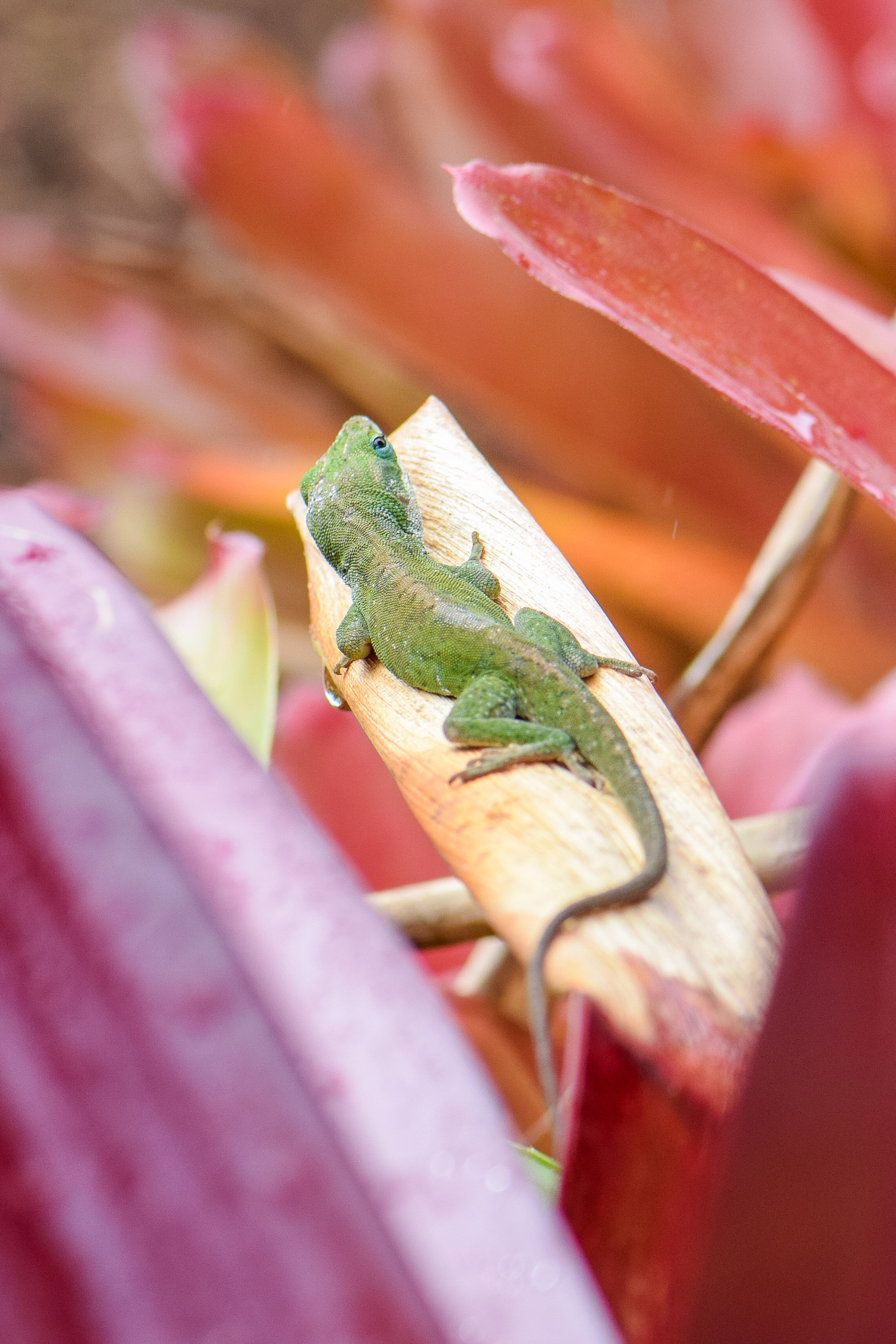 Geckos were hanging out everywhere in the garden, and once we were on the lookout, we saw several. They like to lounge on the large flat leaves in the sun, and they all let me get pretty close to take pictures without moving.