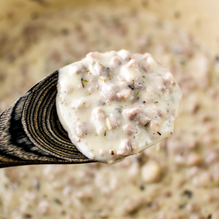 This Paleo & Whole30 Sausage Breakfast Gravy is made using almond milk, broth, coconut cream, and thickened with arrowroot flour for a gluten-free and dairy-free breakfast of champions! Serve over biscuits or potatoes for maximum comfort food status!