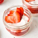 Based on a combination of my original recipes for Whipped Greek Yogurt (this post has a video!) and Easy Strawberry Sauce. For the cups, I used half pint mason jars purchased at my local grocery store. Nutrition information estimated with My Fitness Pal.