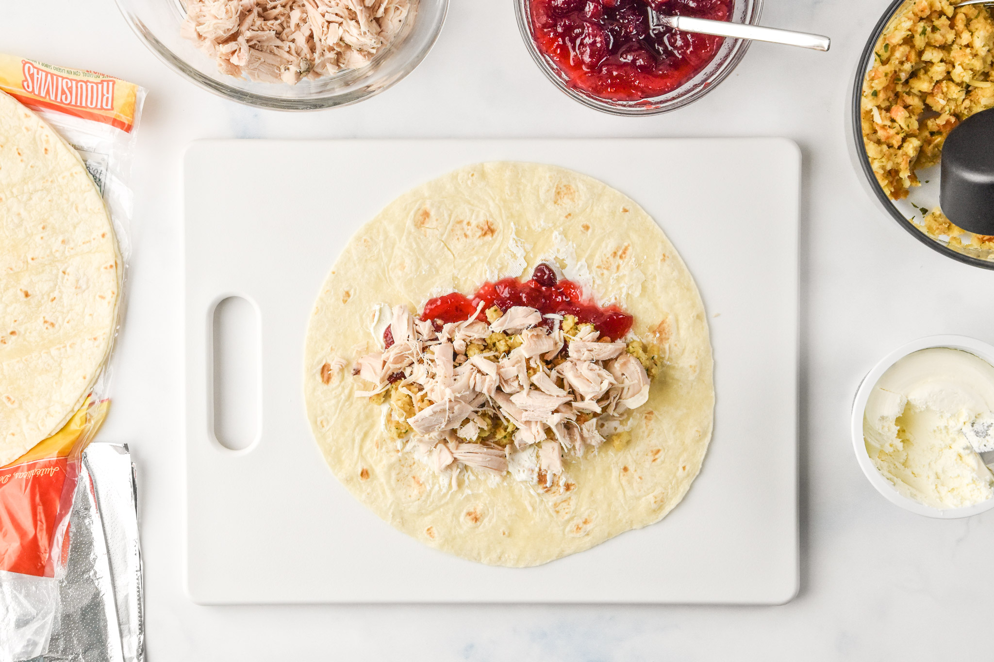 - Stuff it: Using a butter knife, spread cream cheese on the tortilla (room temperature or whipped cream cheese will help you not rip your tortilla while spreading). Follow the cream cheese with 2-3 tablespoons cranberry sauce, spreading it over the cream cheese. Add about 1/2 cup stuffing followed by a 1/2 cup diced cooked turkey meat over the cream cheese and cranberries.