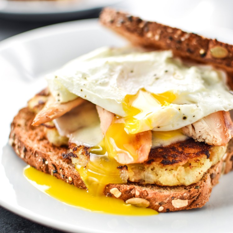 The best use of your holiday leftovers! A stuffing and mashed potato pancake, turkey, and provolone cheese topped with a fried egg!